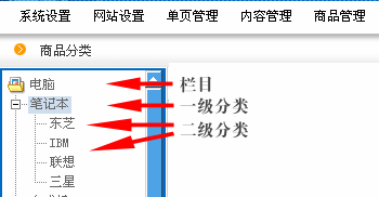 [帮助主题] 怎样进行商品分类 [功能位置] 商品管理->商品分类 [功能说明] 进入商品分类界面,左侧显示的是商品栏目及栏目下分类的数型菜单。每个商品栏目下有各自的分类,点选左侧的商品栏目,在右侧添加该栏目下的一级分类,点选左侧的一级分类,在右侧添加该分类的下级分类。如图:
